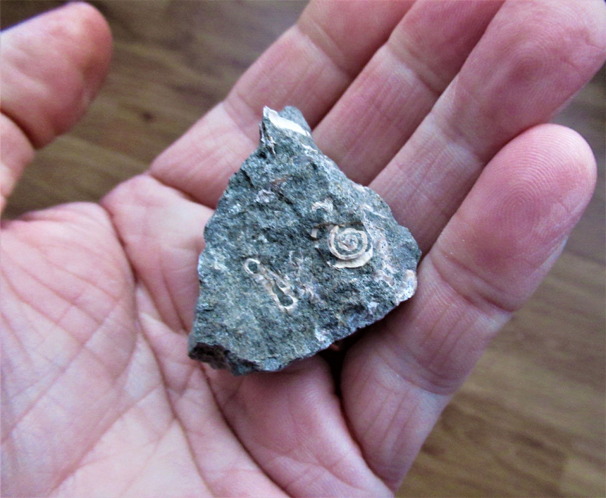A split block of greensand containing pink fossilised remains of this very interesting worm tube almost resembling ammonites due to the planispiral orientation .